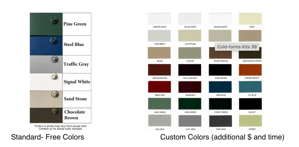 Our cold-form steel buildings come with a variety of color options to suit any style. Choose from six standard colors—Pine Green, Steel Blue, Traffic Gray, Signal White, Sand Stone, and Chocolate Brown—included at no additional cost. For those looking for a more personalized touch, an extended selection of custom colors is available for an additional charge and lead time. All finishes are powder-coated for long-lasting protection against fading, chipping, and rust.