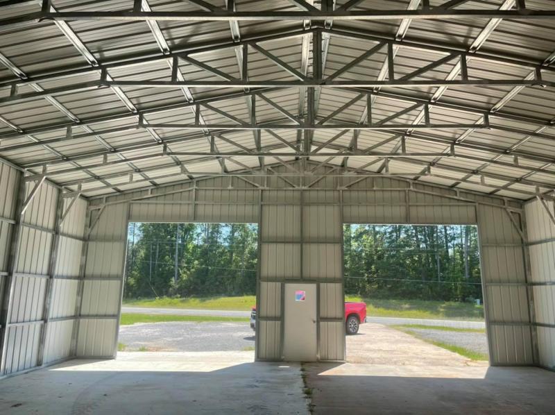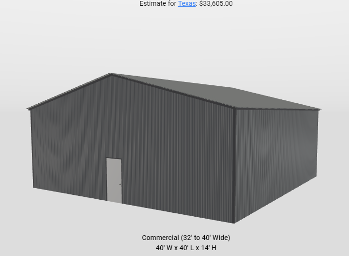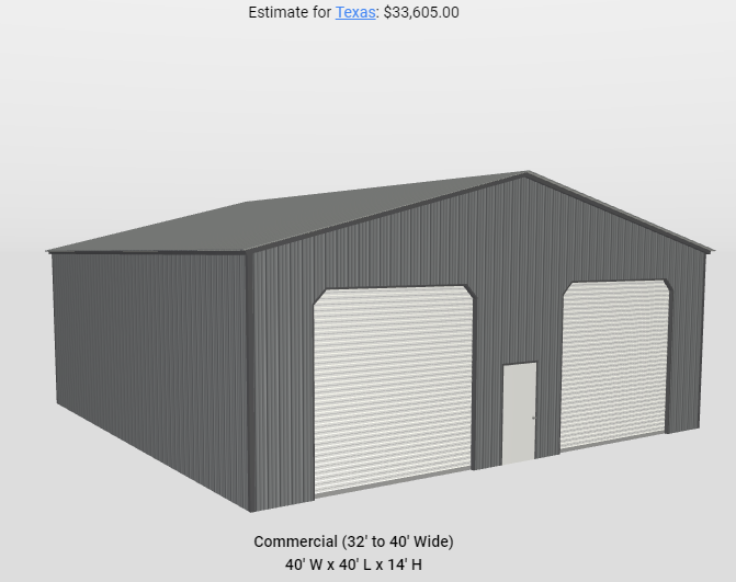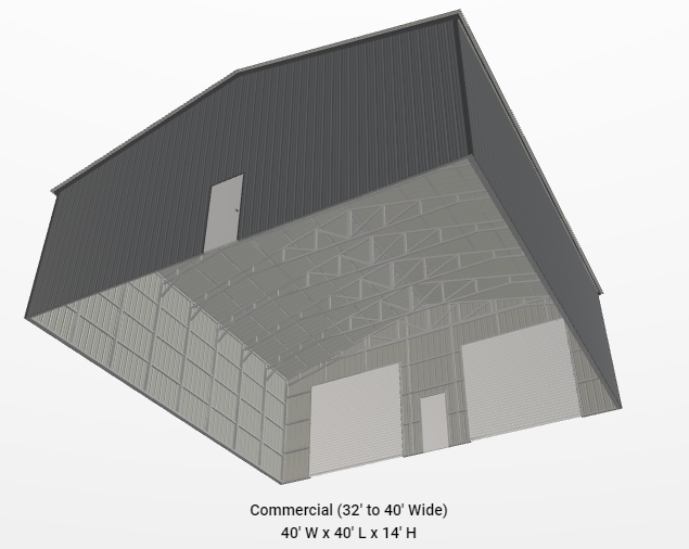 This 40′ x 40′ x 14′ commercial building can be yours (built on your property on your level land or concrete pad) including twin 12’x12′ roll-up garage doors not yet installed in these images. Two walk in doors included. Can be customized to your preference, and of course your choice of 16 colors to choose from.