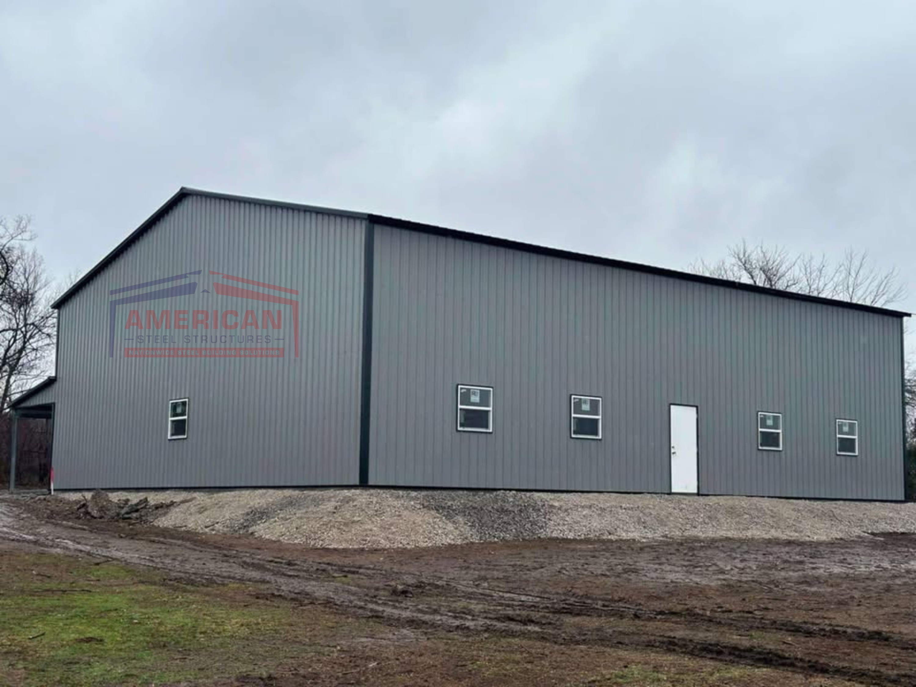 This 40x60x14 metal building is designed for workshops, garages, or commercial use, featuring (3) 12’x12’ garage doors, (2) residential man doors, (6) 3’x3’ windows, and a 10’x15’x7’ front porch/lean-to for added functionality. With quick 3-4 week lead times, this pre-engineered steel structure is built for fast installation and long-term durability.