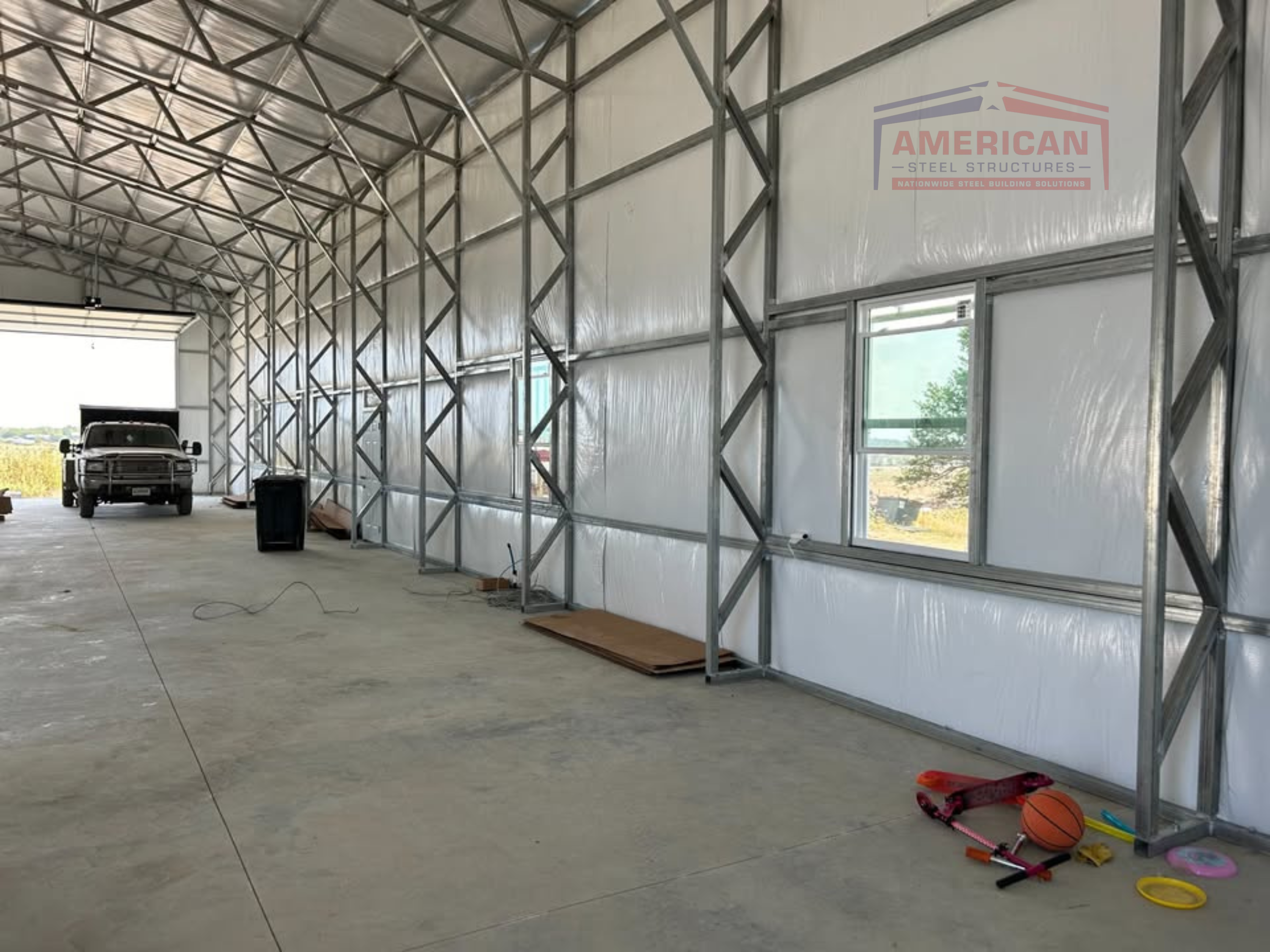 This 60x100x16 pre-engineered steel building is the ultimate solution for commercial, agricultural, or industrial use. Featuring robust webbed truss framing, (3) 12’x12’ and (2) 14’x14’ framed garage door openings, (2) steel entry doors, and full 2” vinyl-backed fiberglass insulation, this building is designed for durability and efficiency.